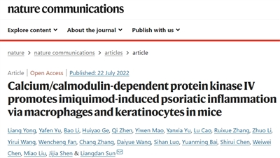 本报讯 7月22日,安徽医科大学第一附属医院、安徽医科大学皮肤病学教育部重点实验室、安徽医科大学皮肤病研究所孙良丹团队在《自然》(Nature)子刊《自然·通讯》(Nature Communications)(IF:17.694,CiteScore:23.2)上发表了题为“钙/钙调蛋白依赖性蛋白激酶IV通过巨噬细胞和角质形成细胞促进咪喹莫特诱导的小鼠银屑病炎症”的研究论文。安徽医科大学第一附属医院皮肤科为第一作者和通讯作者单位。