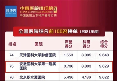 2022年11月20日下午,由复旦大学医院管理研究所发布的《2021年度中国医院综合排行榜》和《2021年度中国医院专科声誉排行榜》正式出炉。安医大一附院综合排名全国第75位,华东地区第15位,安徽省第一。其中科研学术排名全国第45位,较去年上升5位。
