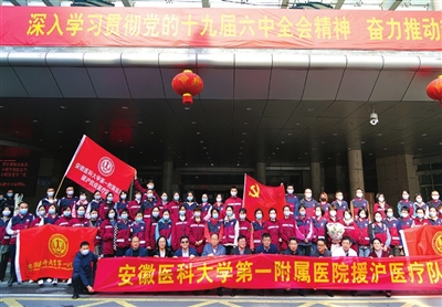 2022年4月2日上午,按照省委、省政府和上级主管部门统一部署,由安医大一附院牵头组建的安医大一附院援沪医疗队正式启程,奔赴上海抗疫一线。医疗队整建制接管上海崇明花博会复兴馆方舱医院安医大一附院方舱院区,坚持以党建引领援沪抗疫工作,在临时党总支的带领下,医疗队率先开舱,创新提出打造“最暖方舱”理念,率先开展患者核酸检测,开展“党员示范岗”等,53天的时间里累计收治患者2501人,完成患者核酸采集13418人次,患者满意度98.27%,实现了“患者零死亡,医务人员零感染”的总目标。受到人民日报、新华社、新华网、人民网、央广网、上海东方卫视、东方财经、安徽电视台、安徽之声、新安晚报、江淮晨报等各级媒体的关注和报道,以实际行动护佑人民生命健康。