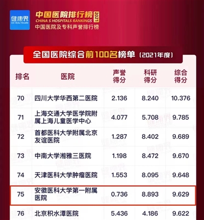 2022年,医院科技影响力进一步上升,学术成果丰硕,连续12年入选中国医院排行榜全国百强,2021年全国综合排名75位,华东地区第15位,安徽省第一,其中科研学术排名全国第45位,较去年上升5位;中国医院科技量值排名全国第61位,创5年来新高,30个学科进入全国百强,19个学科居安徽省第一,综合实力稳居安徽省首位。