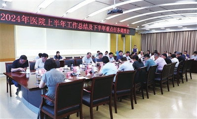本报讯 7月3日下午,医院在干部保健中心楼二楼会议室召开2024年上半年工作总结及下半年重点任务工作调度会。院领导班子全体成员出席会议,各职能处室负责人参加会议。会议由常务副院长李家斌主持。